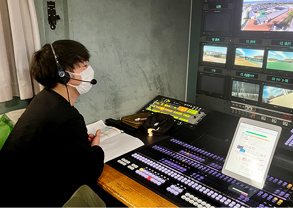 試合を見ながら、カメラマンに撮って頂く映像を無線機で指示しています。同時にどのシーンを放送で使うのか、構成やナレーションを考えます。